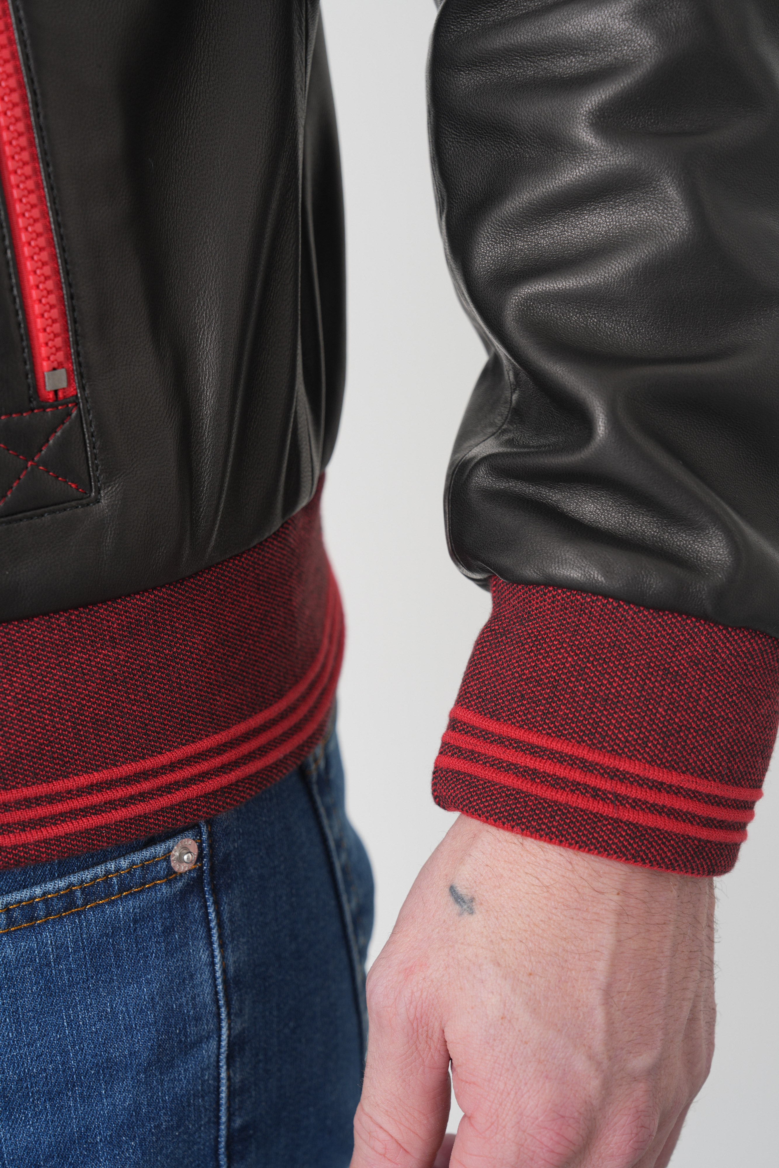 * Контрастный дизайн: Глубокий черный цвет куртки эффектно дополнен темно-красными трикотажными элементами на воротнике-стойке, манжетах и по низу изделия.