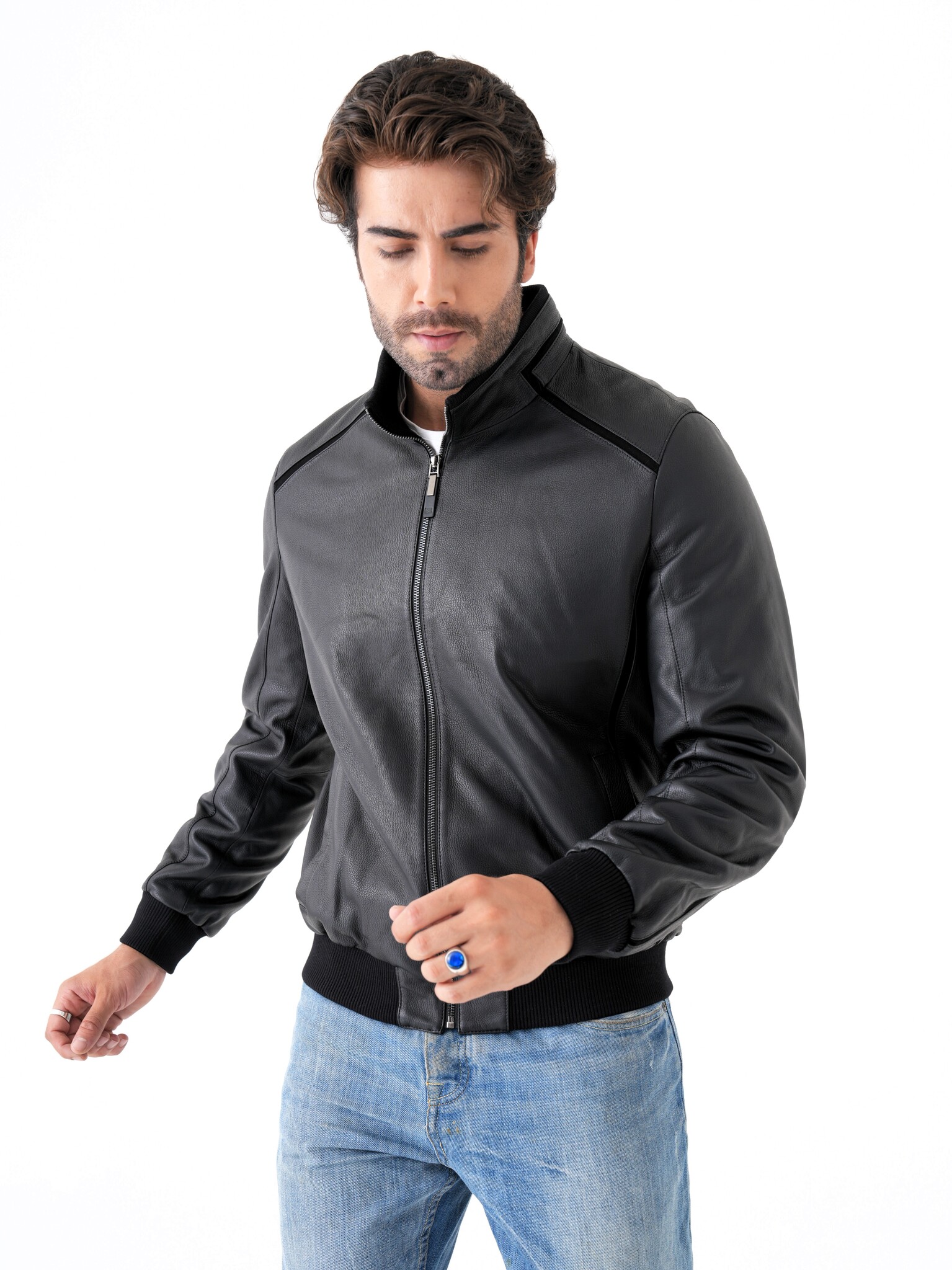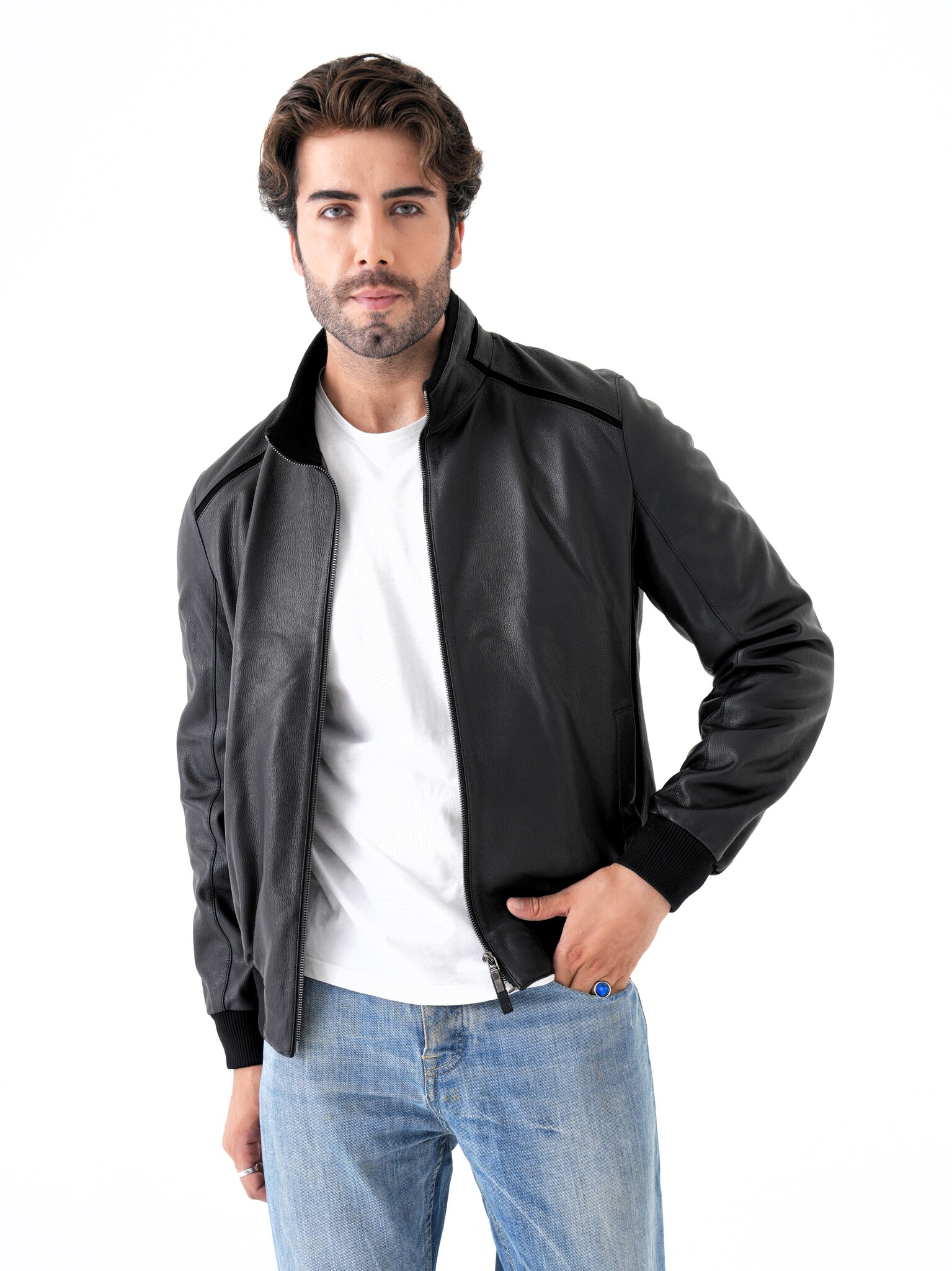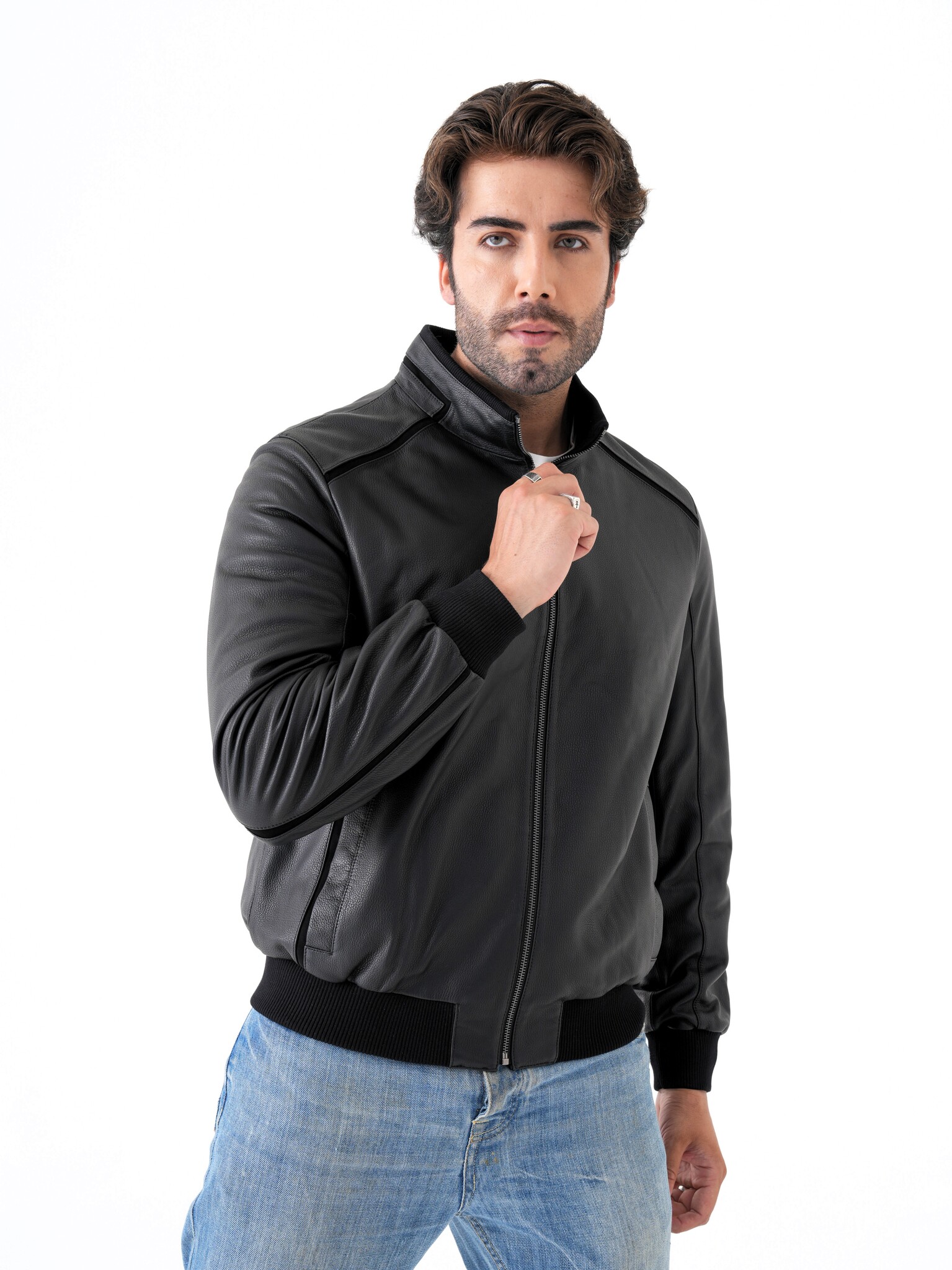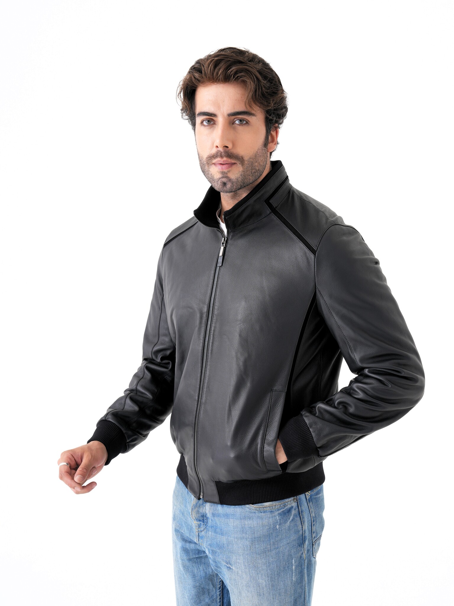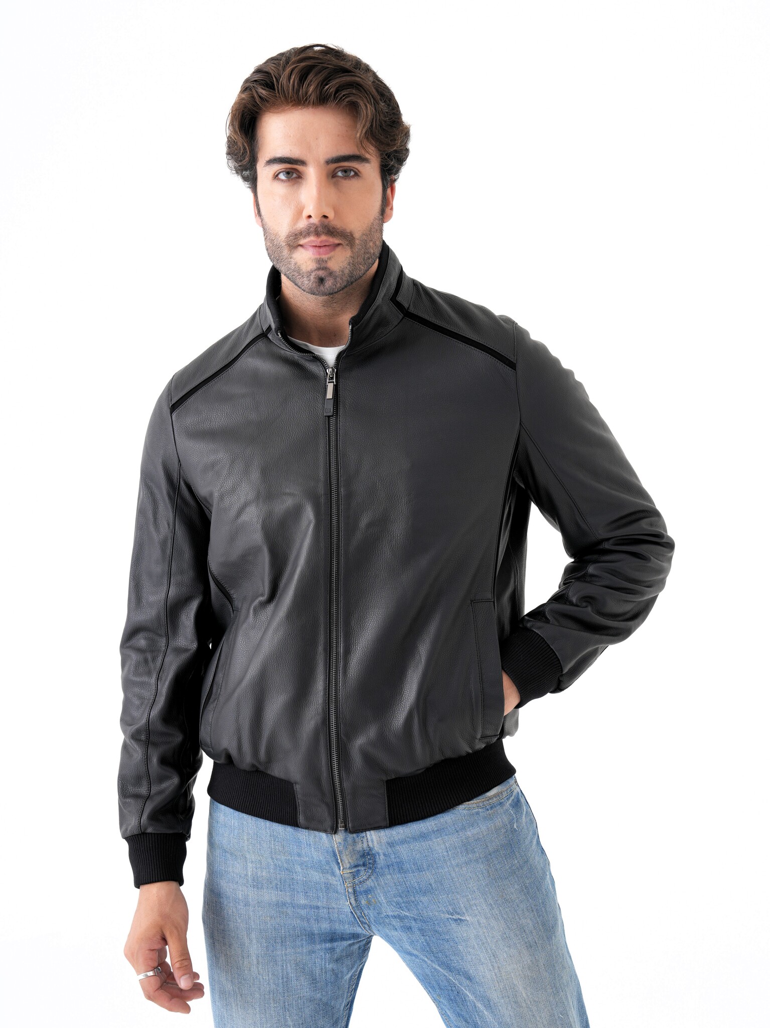 Мужская куртка из натуральной кожи. Классическая модель прямого кроя на молнии с воротником-стойкой и декоративными вставками из замши. Манжеты и нижняя часть куртки на трикотажной резинке. Карманы для рук на магнитной застежке. Имеется два внутренних кармана на молнии. Отлично садится на спортивную фигуру. Эта модель может сочетаться с любыми видами джинс и брюк поэтому подойдет под любой стиль одежды, как повседневный так и деловой. Пошив и производство кожи-Турция.