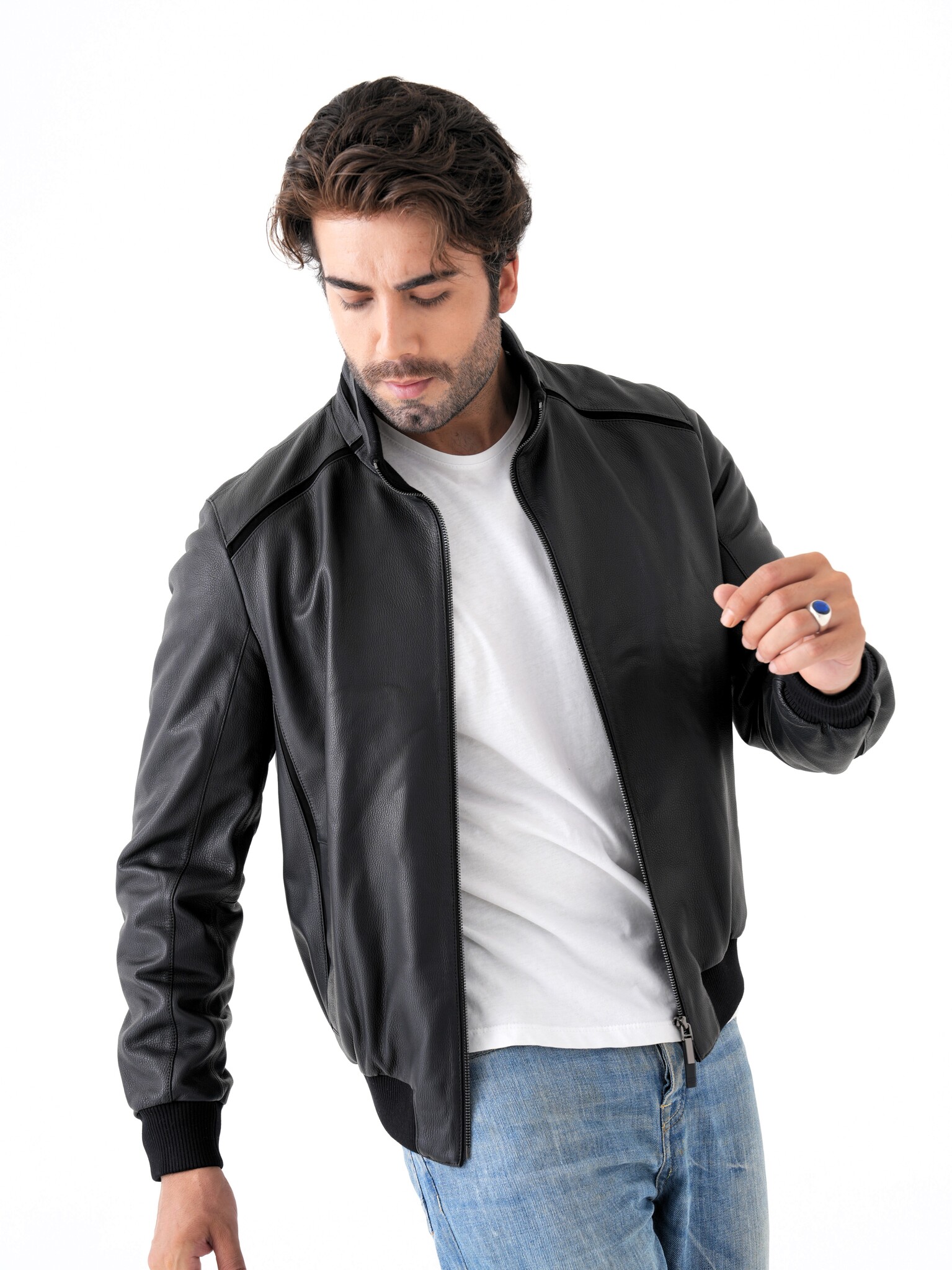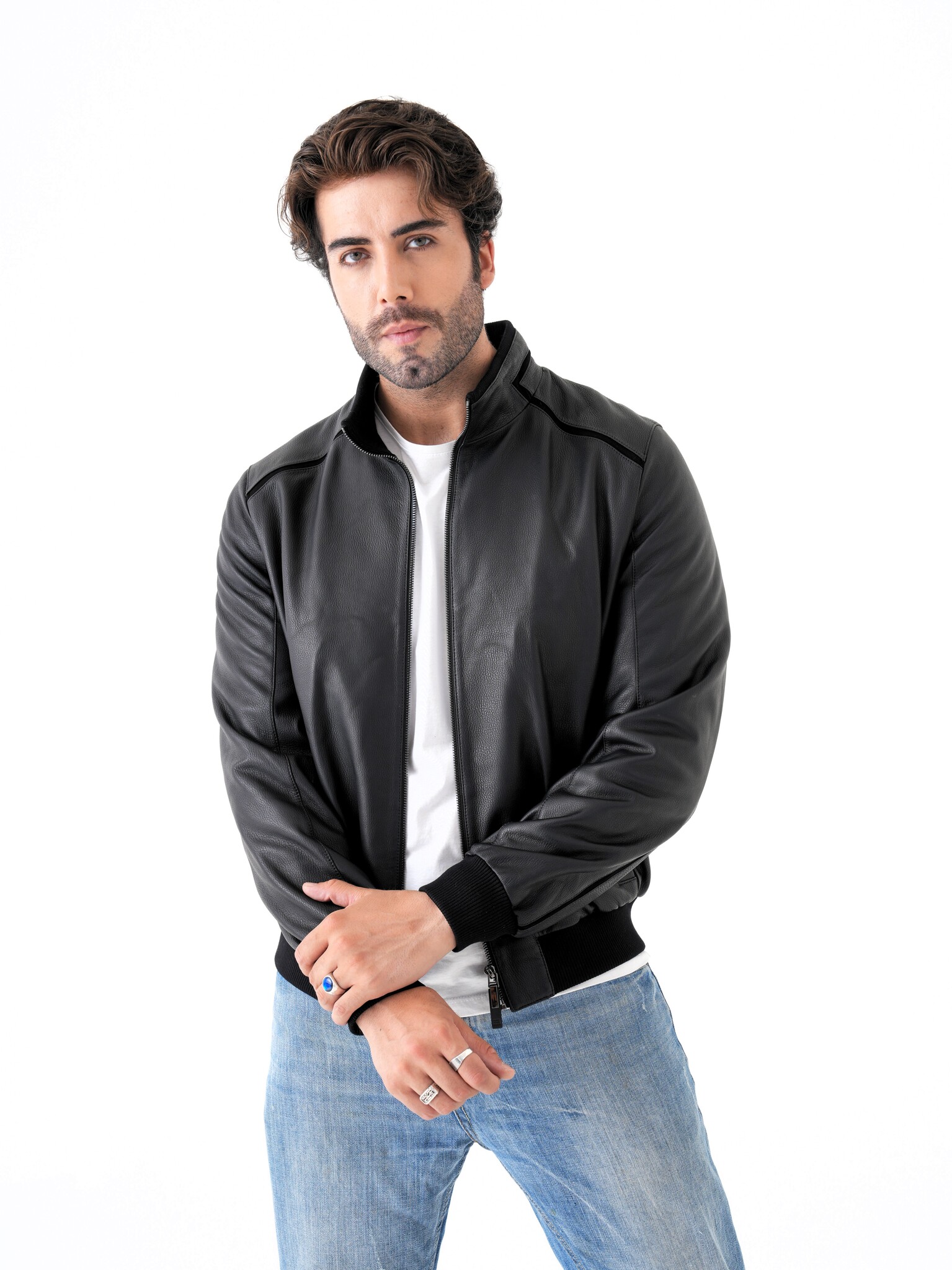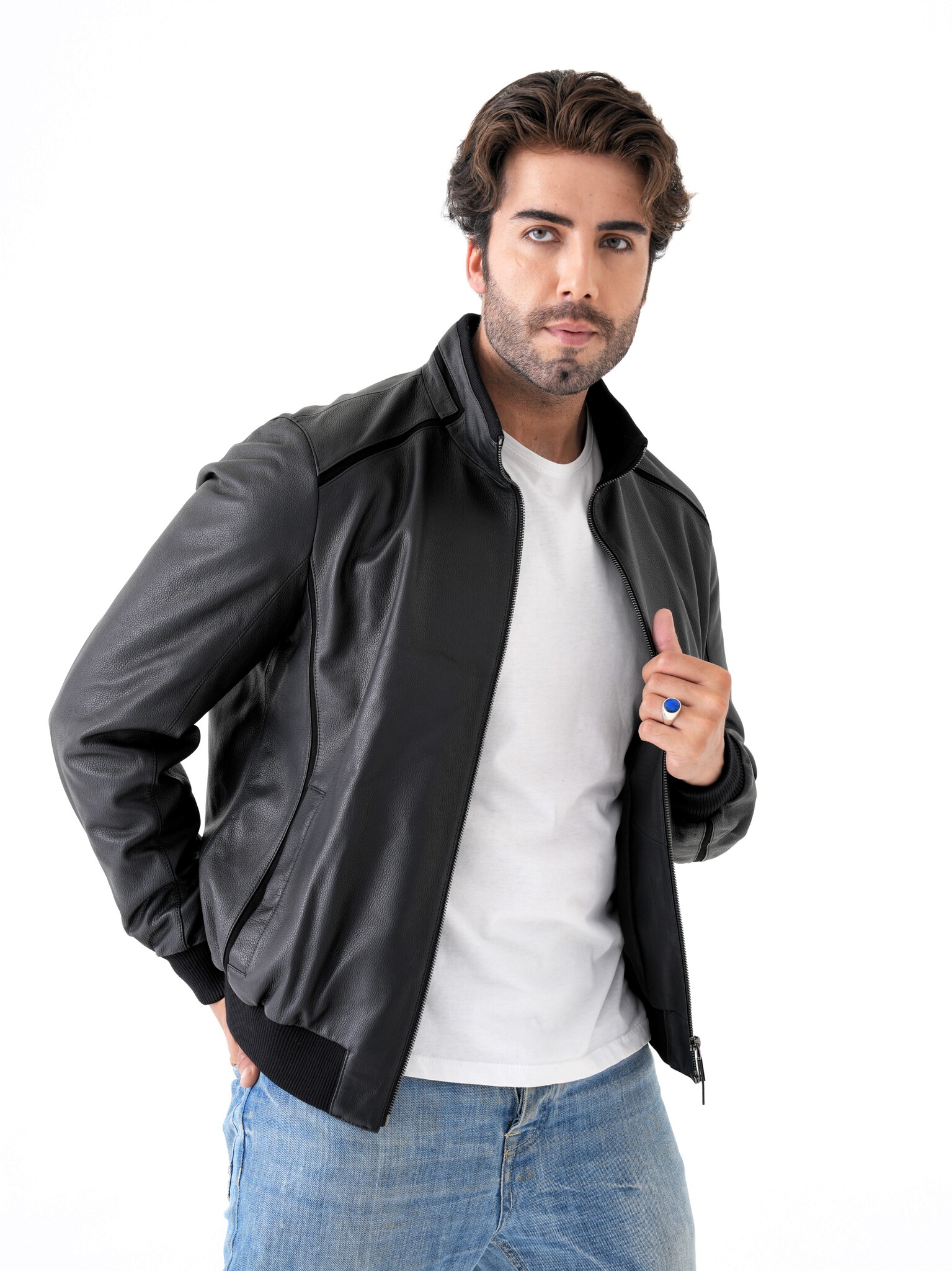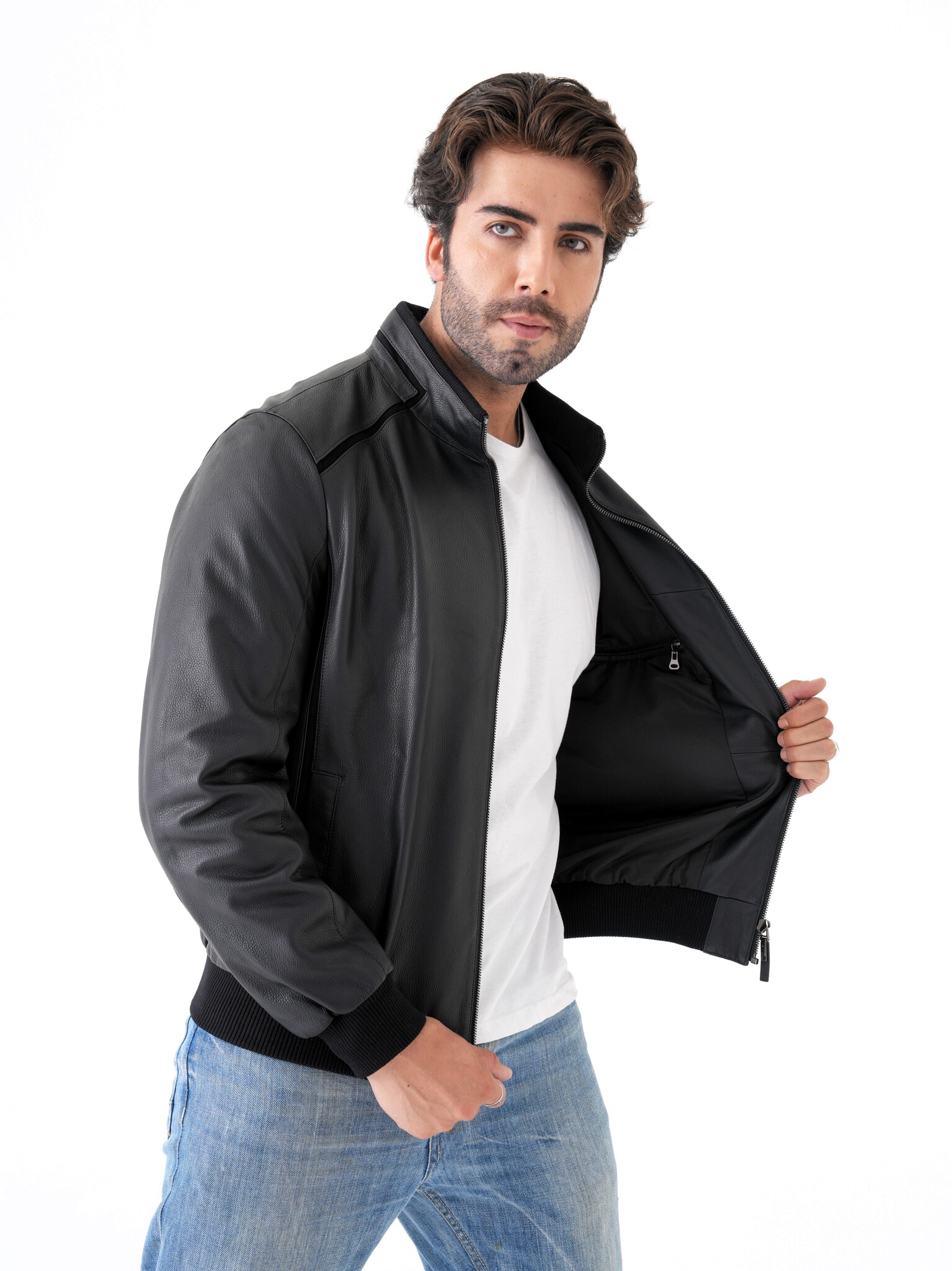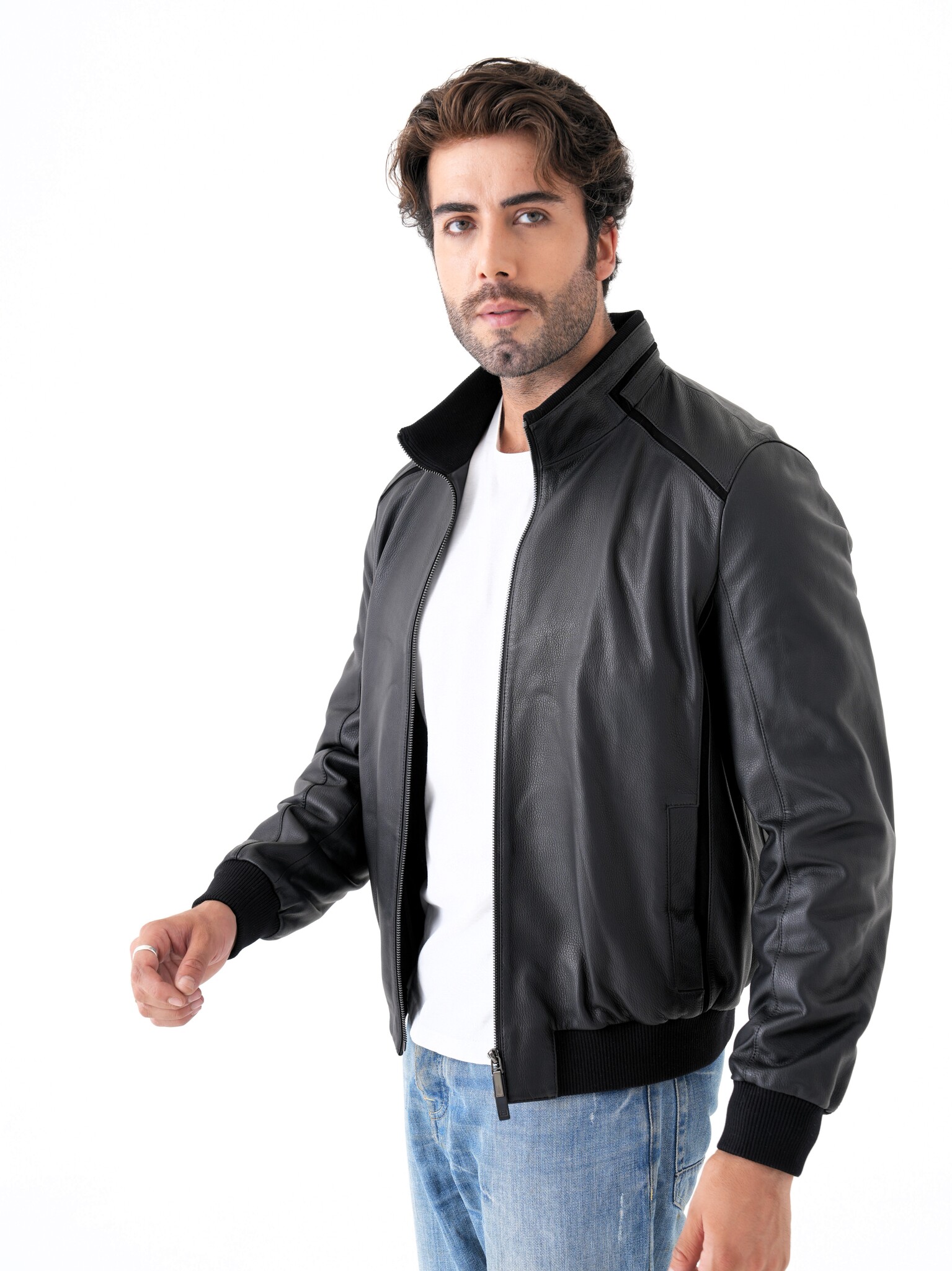 Мужская куртка из натуральной кожи. Классическая модель прямого кроя на молнии с воротником-стойкой и декоративными вставками из замши. Манжеты и нижняя часть куртки на трикотажной резинке. Карманы для рук на магнитной застежке. Имеется два внутренних кармана на молнии. Отлично садится на спортивную фигуру. Эта модель может сочетаться с любыми видами джинс и брюк поэтому подойдет под любой стиль одежды, как повседневный так и деловой. Пошив и производство кожи-Турция.
