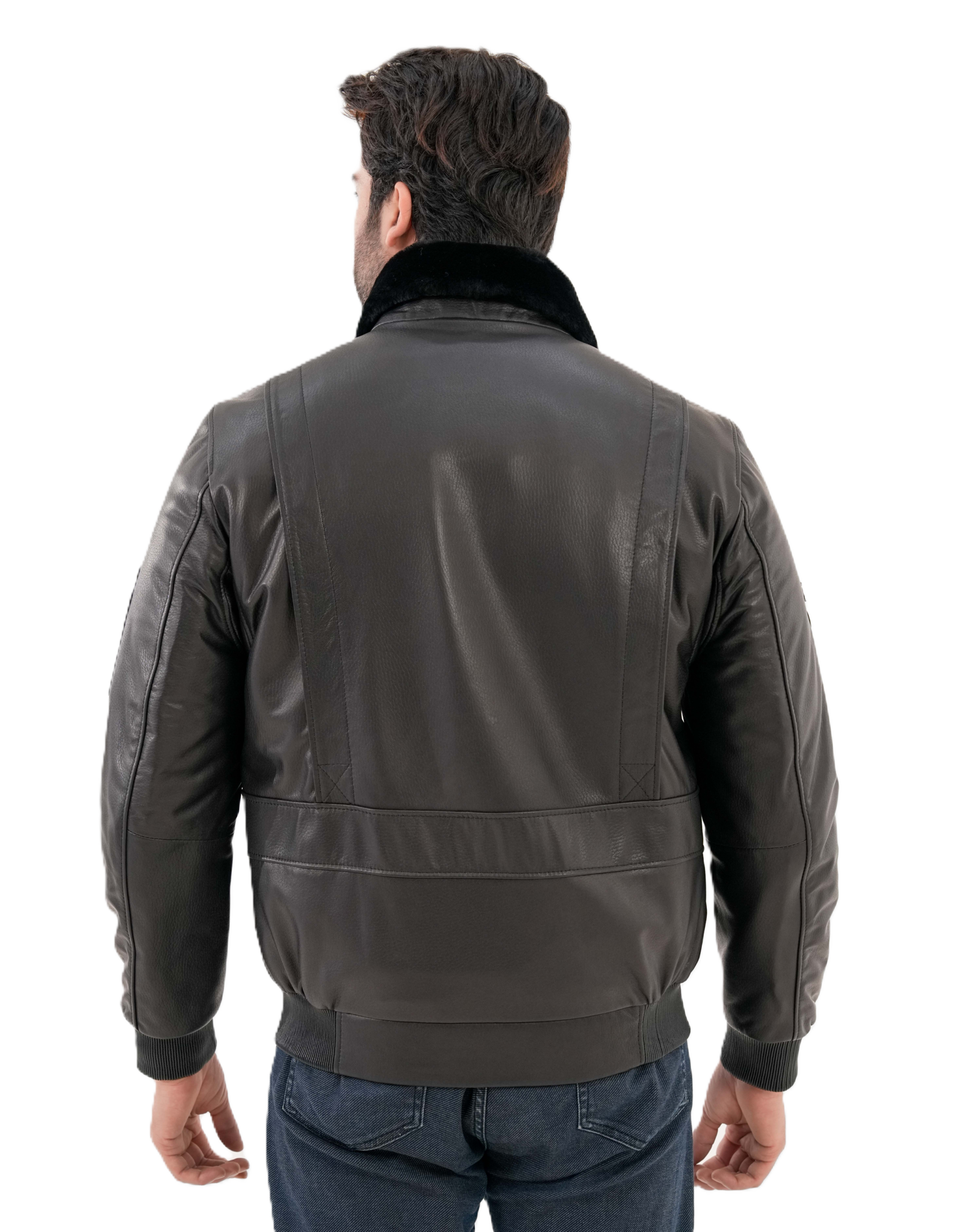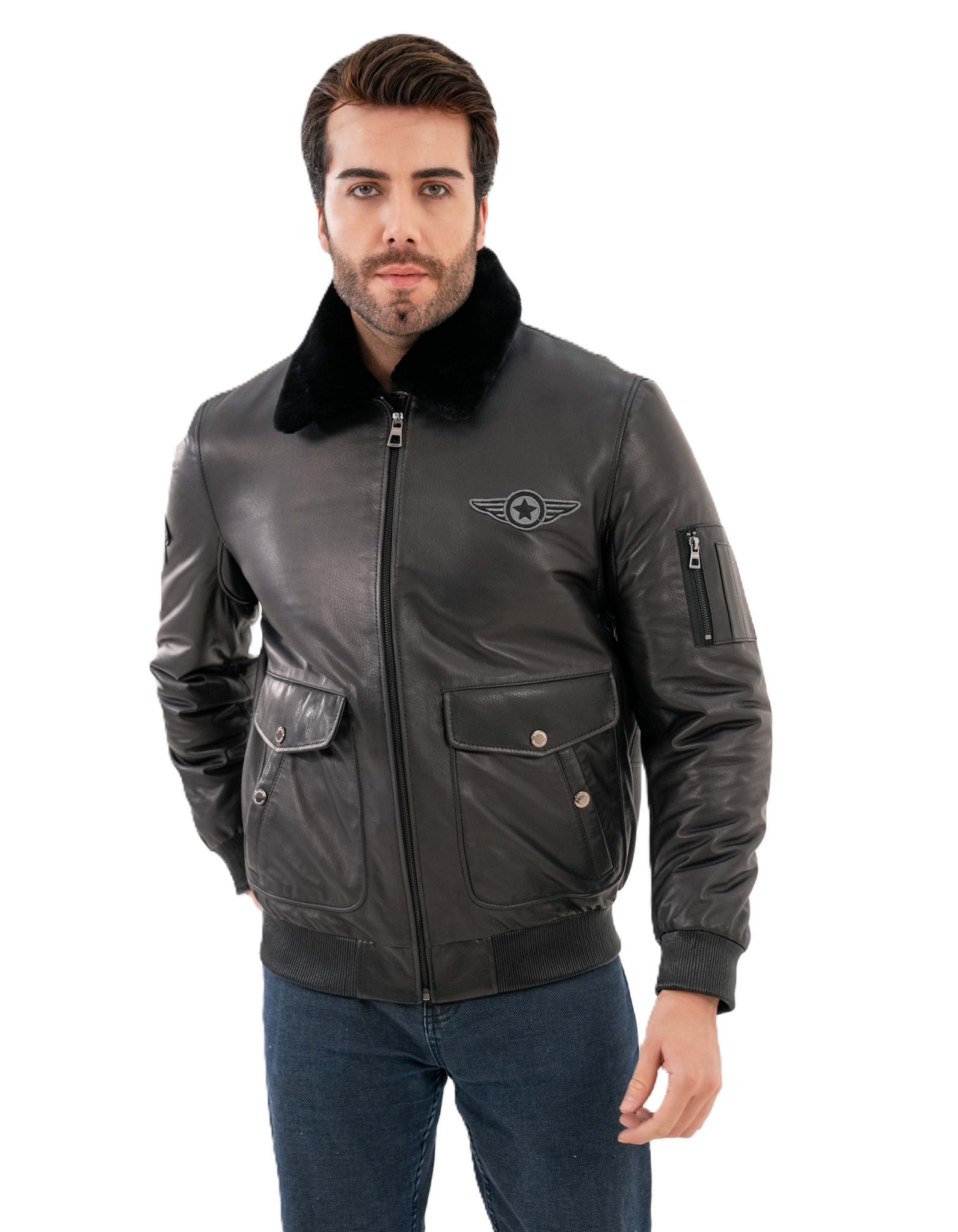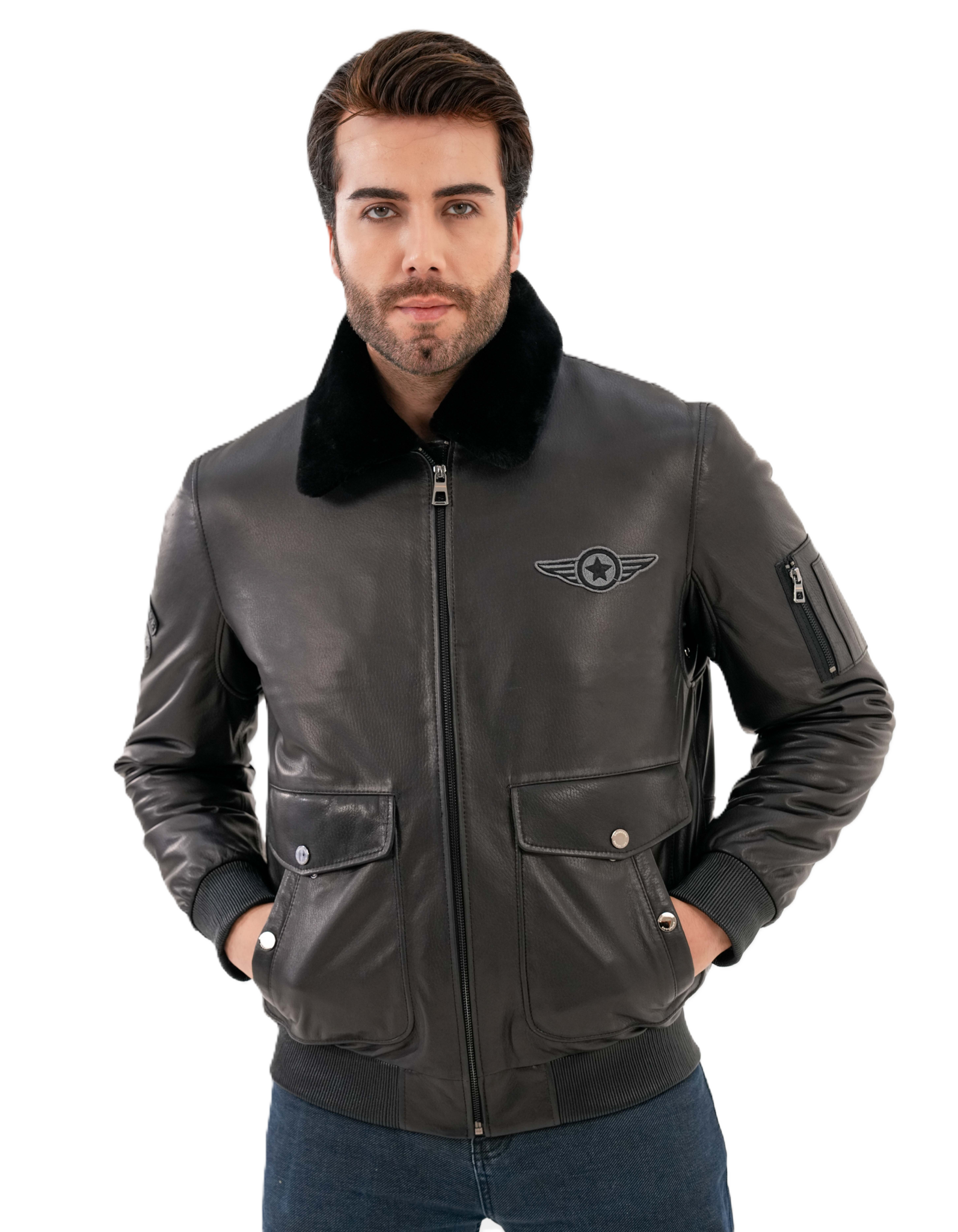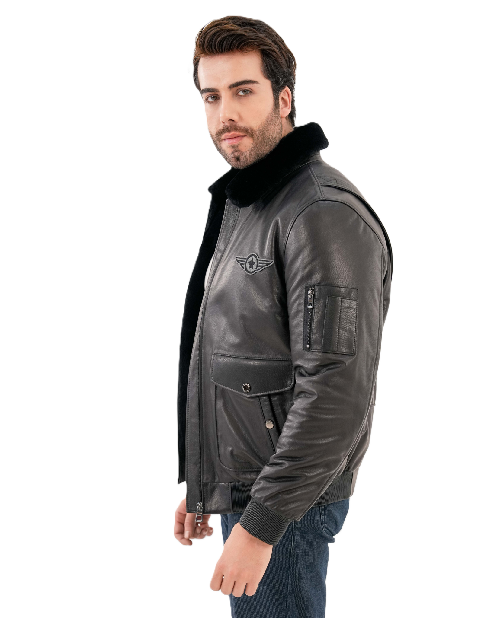 Куртка кожаная мужская зимняя "пилот" из натуральной кожи высокого качества на натуральном меху. Выполнена из кожи с "пористой" и неоднородной структурой подтверждающей натуральность, естественность кожи и предающей ей более дорогой вид в сравнении с "гладкой" кожей. Так же этот способ обработки кожи позволяет одежде сшитой из нее быть более износоустойчивее к царапинам и воздействию окружающей среды поэтому изделия из неё дольше сохраняют отличный внешний вид. Воротник и подкладка из натуральной овчины. Имеется четыре наружных кармана. Два боковых для рук и два с верхней загрузкой. Туда кладут ценные вещи так как из них исключено случайное вываливание. Два внутренних кармана на молнии. Кожа, мех и пошив-Турция.