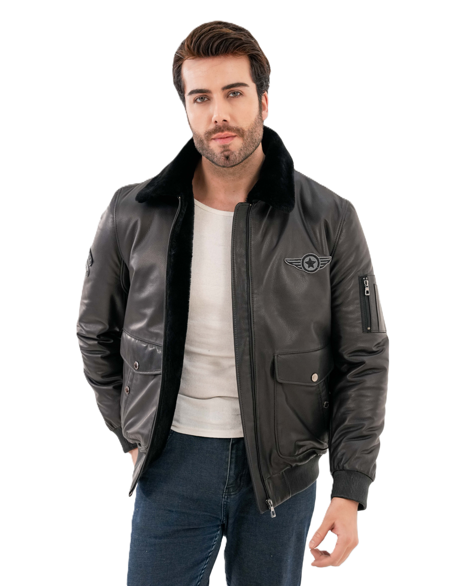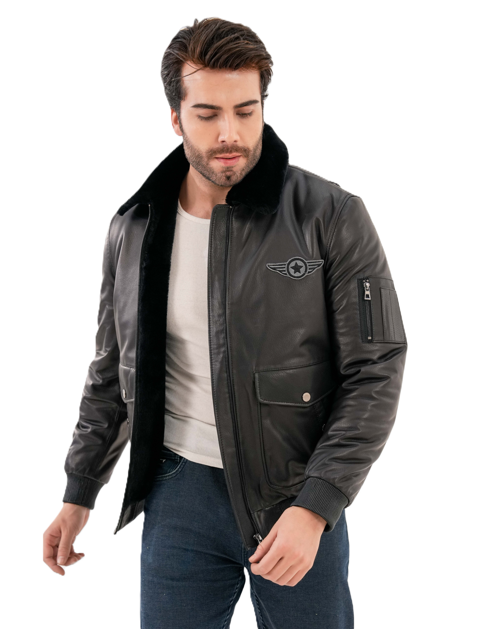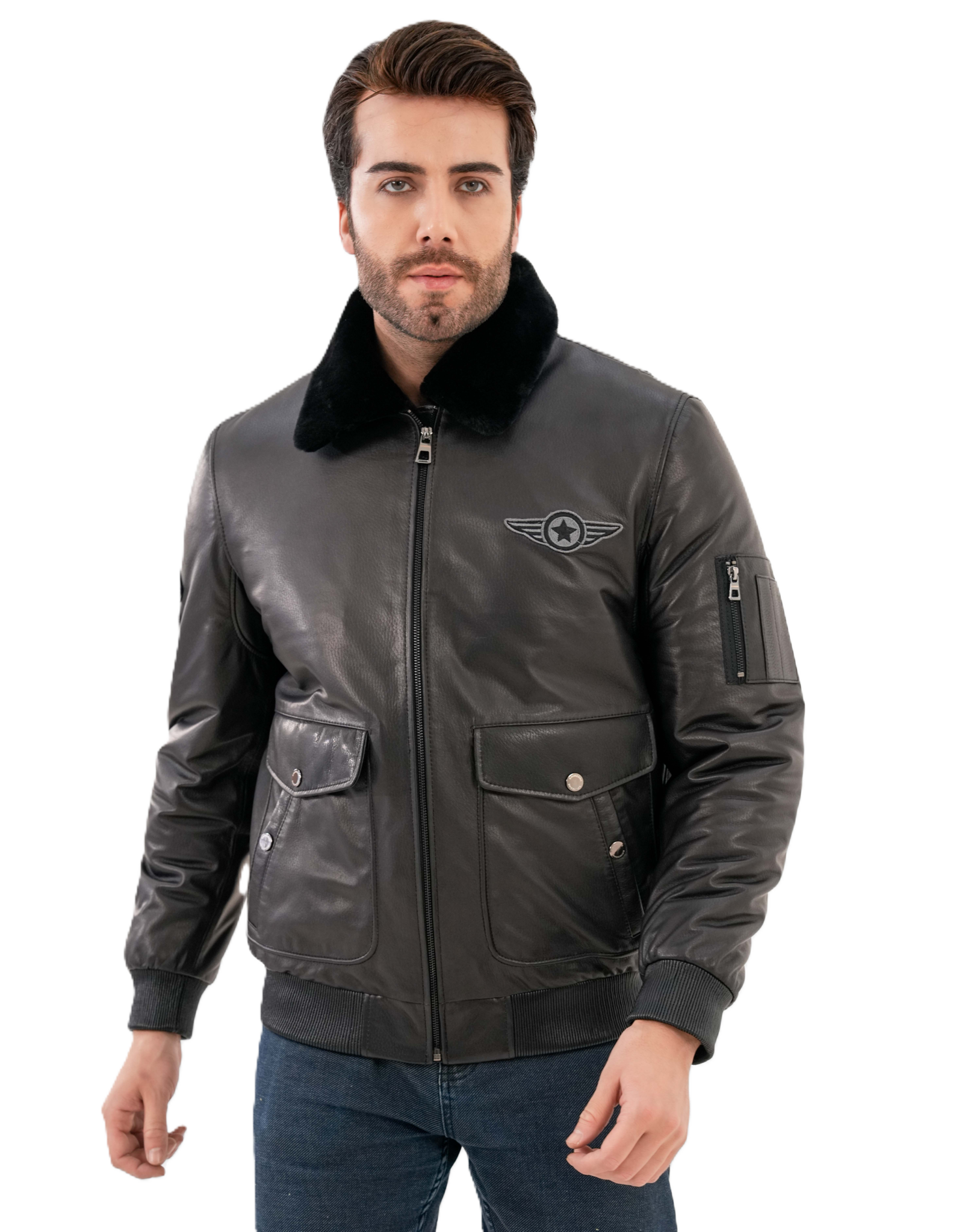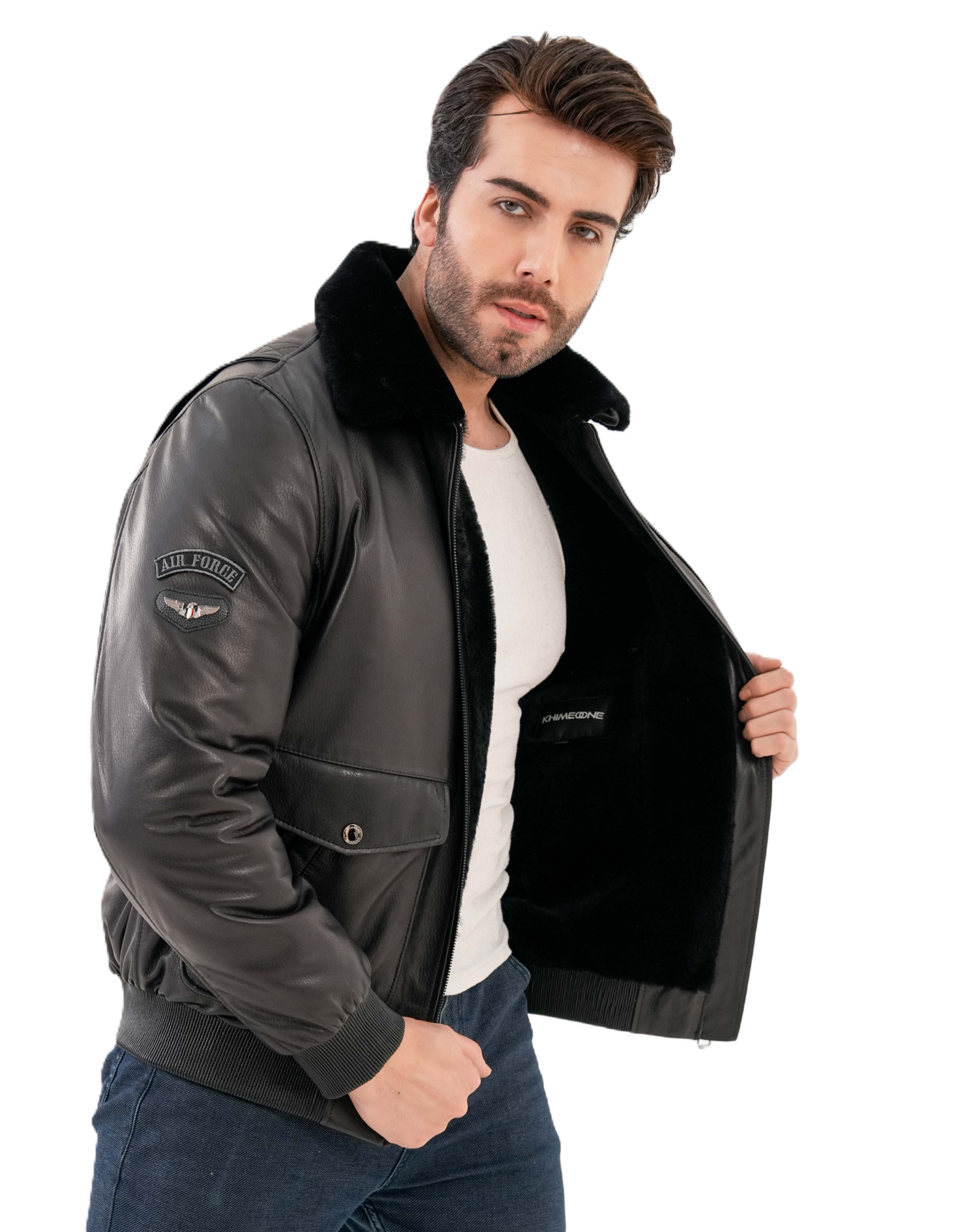 Куртка кожаная мужская зимняя "пилот" из натуральной кожи высокого качества на натуральном меху. Выполнена из кожи с "пористой" и неоднородной структурой подтверждающей натуральность, естественность кожи и предающей ей более дорогой вид в сравнении с "гладкой" кожей. Так же этот способ обработки кожи позволяет одежде сшитой из нее быть более износоустойчивее к царапинам и воздействию окружающей среды поэтому изделия из неё дольше сохраняют отличный внешний вид. Воротник и подкладка из натуральной овчины. Имеется четыре наружных кармана. Два боковых для рук и два с верхней загрузкой. Туда кладут ценные вещи так как из них исключено случайное вываливание. Два внутренних кармана на молнии. Кожа, мех и пошив-Турция.