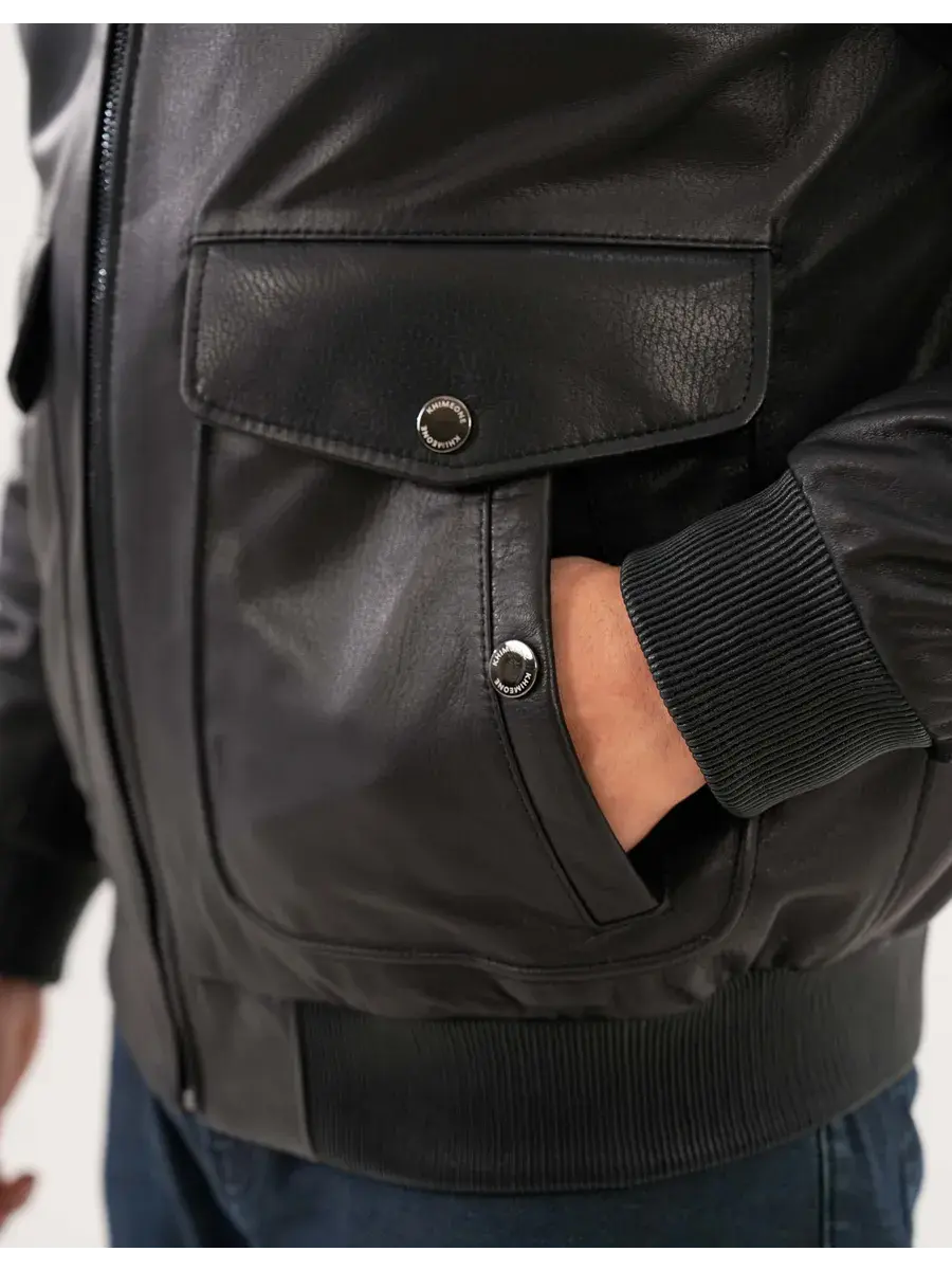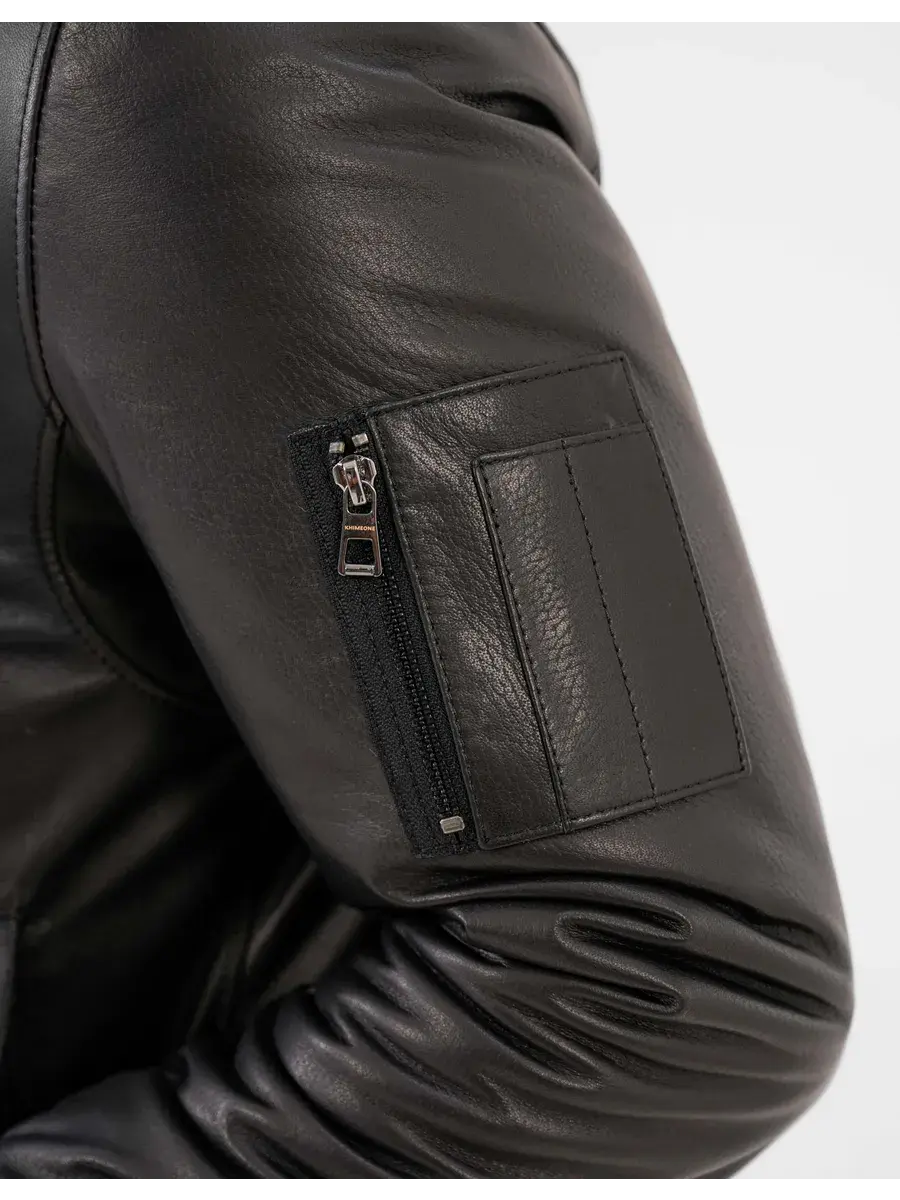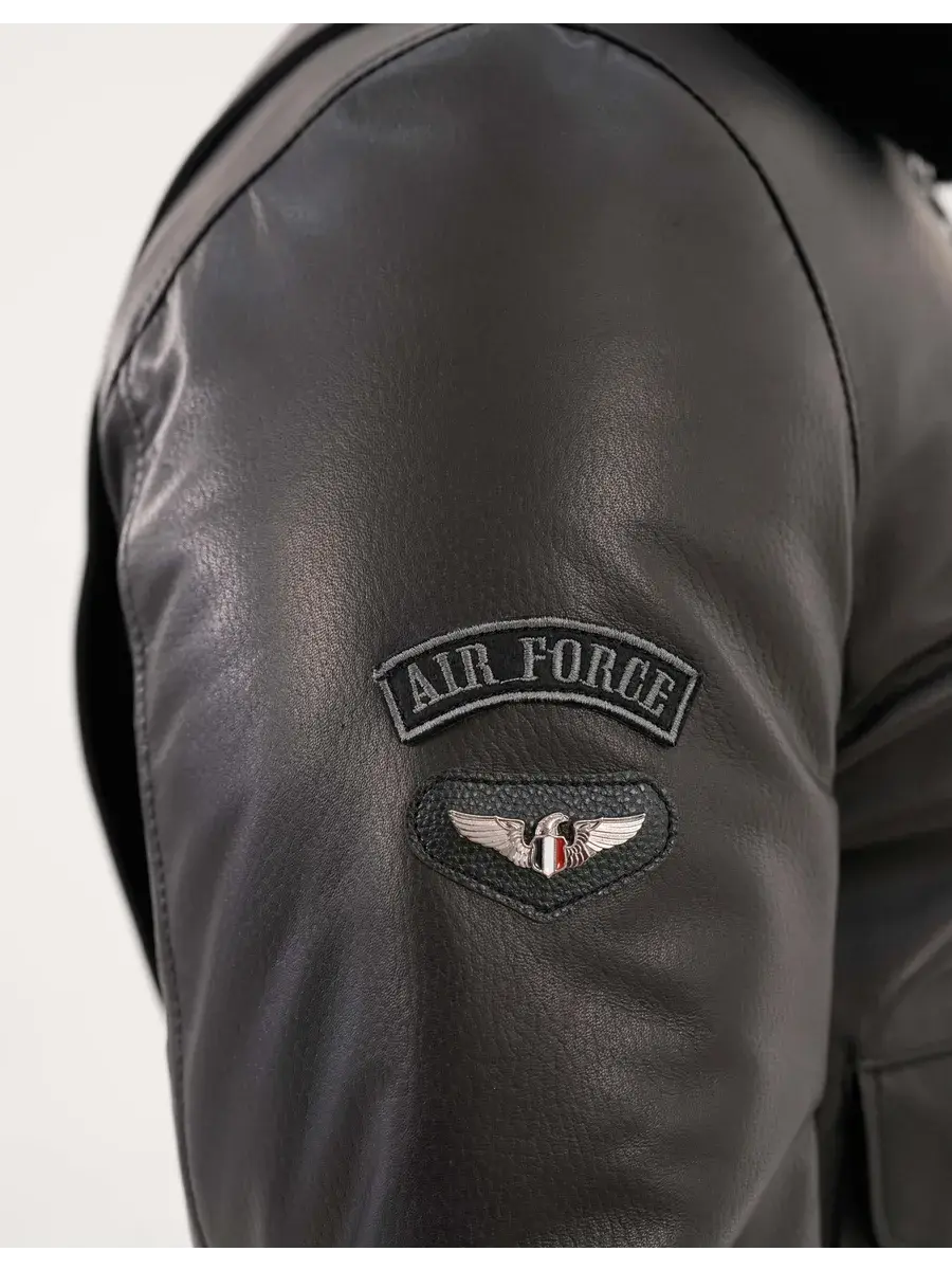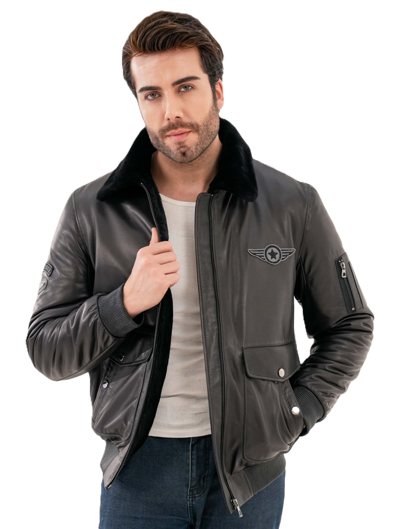 Куртка кожаная мужская зимняя "пилот" из натуральной кожи высокого качества на натуральном меху. Выполнена из кожи с "пористой" и неоднородной структурой подтверждающей натуральность, естественность кожи и предающей ей более дорогой вид в сравнении с "гладкой" кожей. Так же этот способ обработки кожи позволяет одежде сшитой из нее быть более износоустойчивее к царапинам и воздействию окружающей среды поэтому изделия из неё дольше сохраняют отличный внешний вид. Воротник и подкладка из натуральной овчины. Имеется четыре наружных кармана. Два боковых для рук и два с верхней загрузкой. Туда кладут ценные вещи так как из них исключено случайное вываливание. Два внутренних кармана на молнии. Кожа, мех и пошив-Турция.