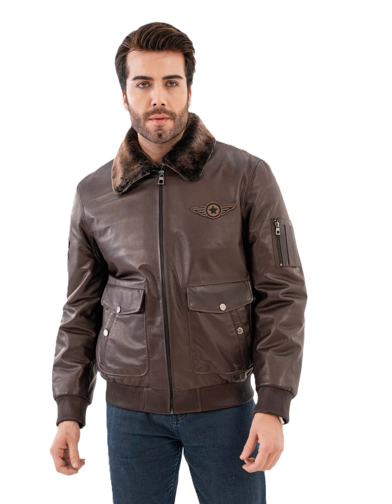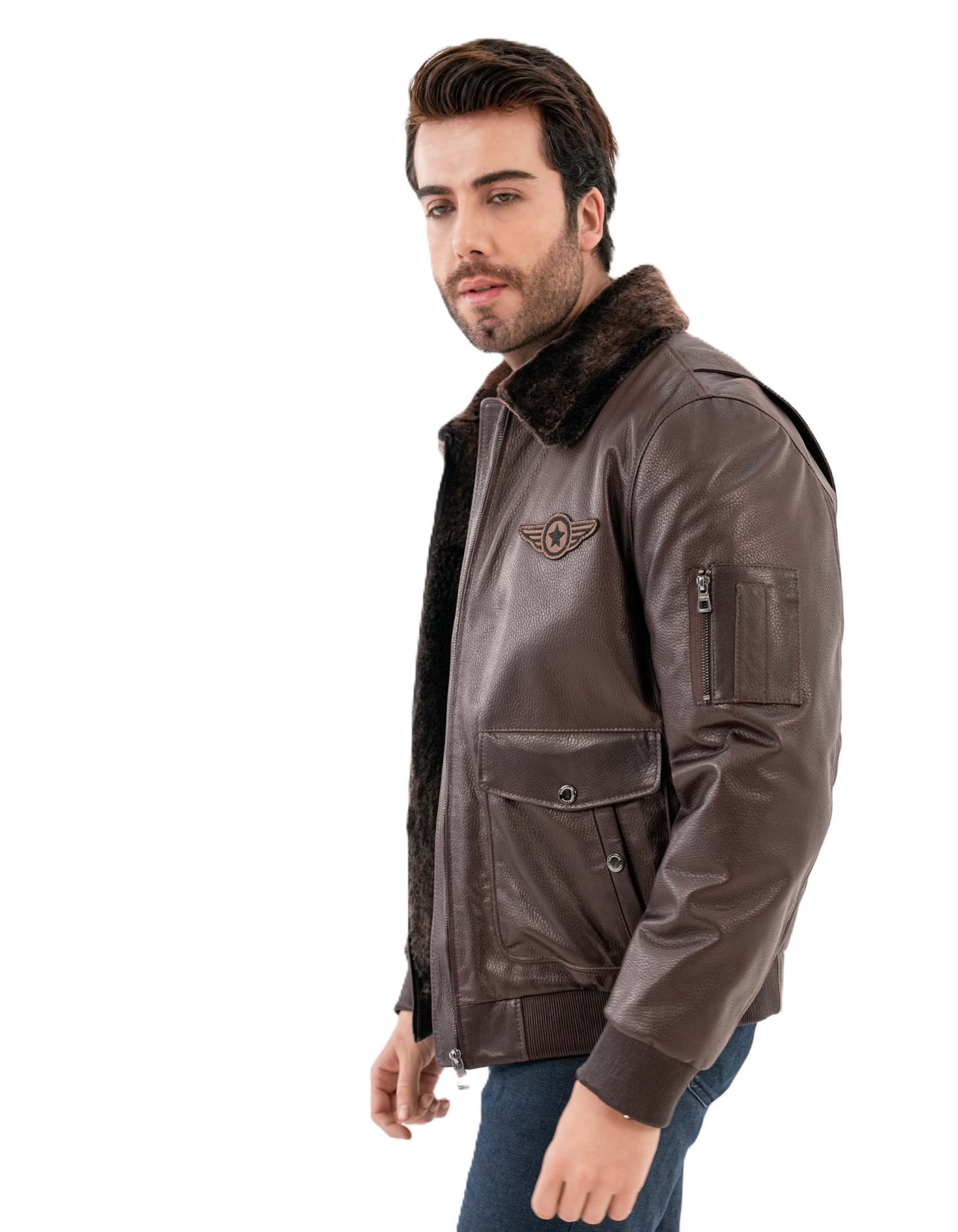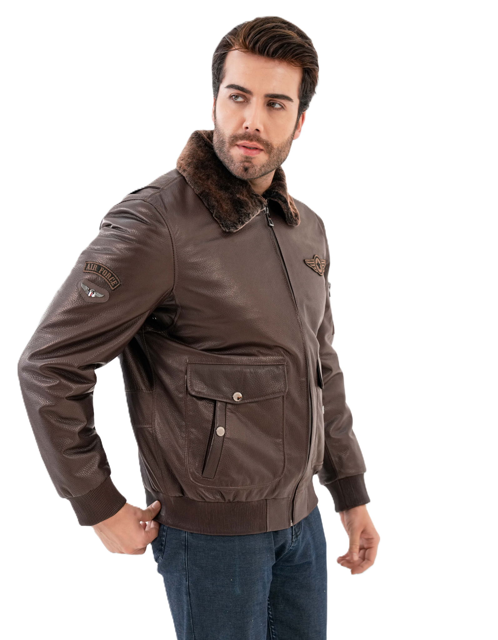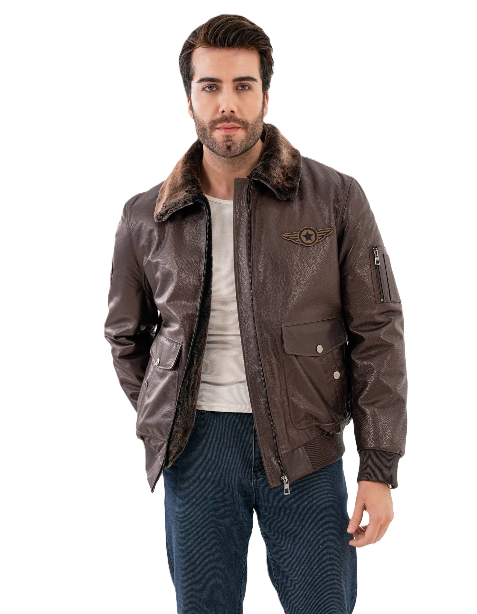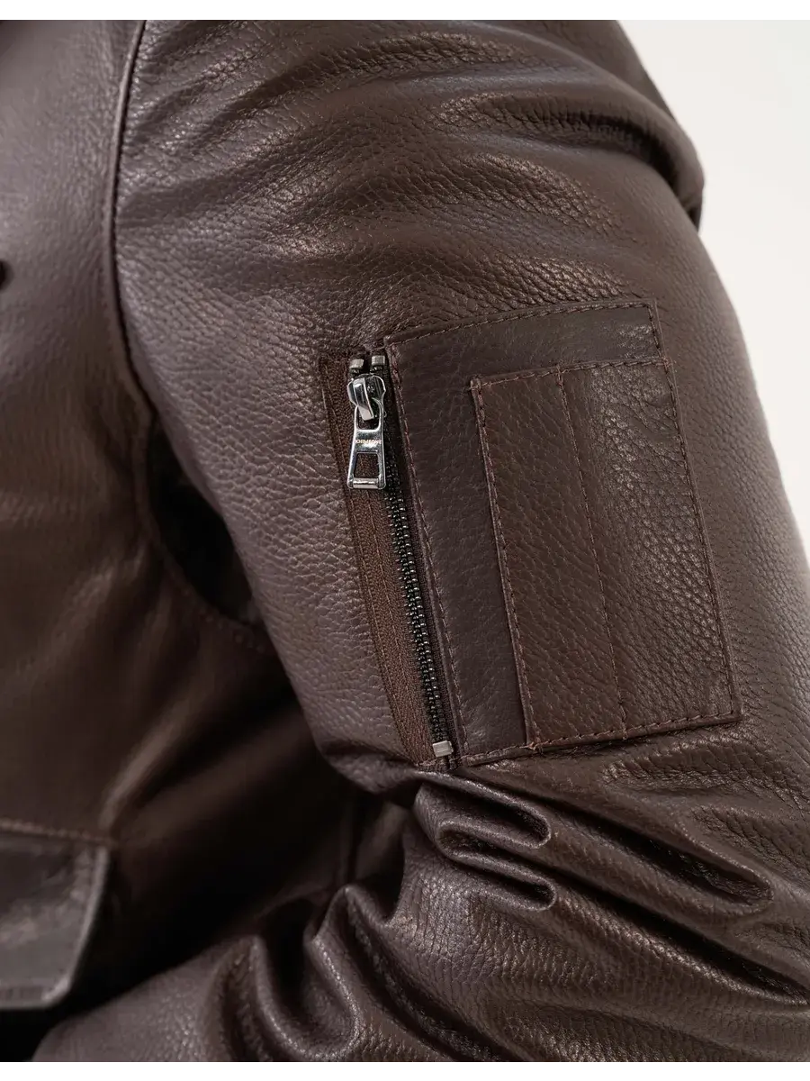 Куртка кожаная мужская зимняя "пилот" из натуральной кожи высокого качества на натуральном меху. Выполнена из кожи с "пористой" и неоднородной структурой подтверждающей натуральность, естественность кожи и предающей ей более дорогой вид в сравнении с "гладкой" кожей. Так же этот способ обработки кожи позволяет одежде сшитой из нее быть более износоустойчивее к царапинам и воздействию окружающей среды поэтому изделия из неё дольше сохраняют отличный внешний вид. Воротник и подкладка из натуральной овчины. Имеется четыре наружных кармана. Два боковых для рук и два с верхней загрузкой. Туда кладут ценные вещи так как из них исключено случайное вываливание. Два внутренних кармана на молнии. Кожа, мех и пошив-Турция.