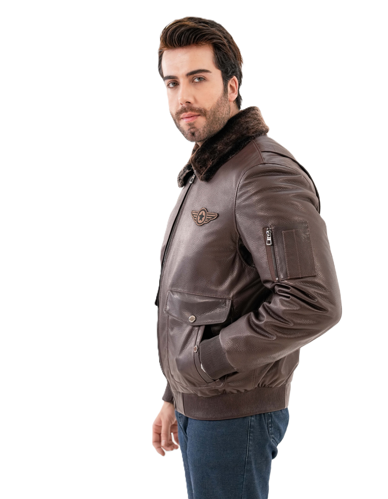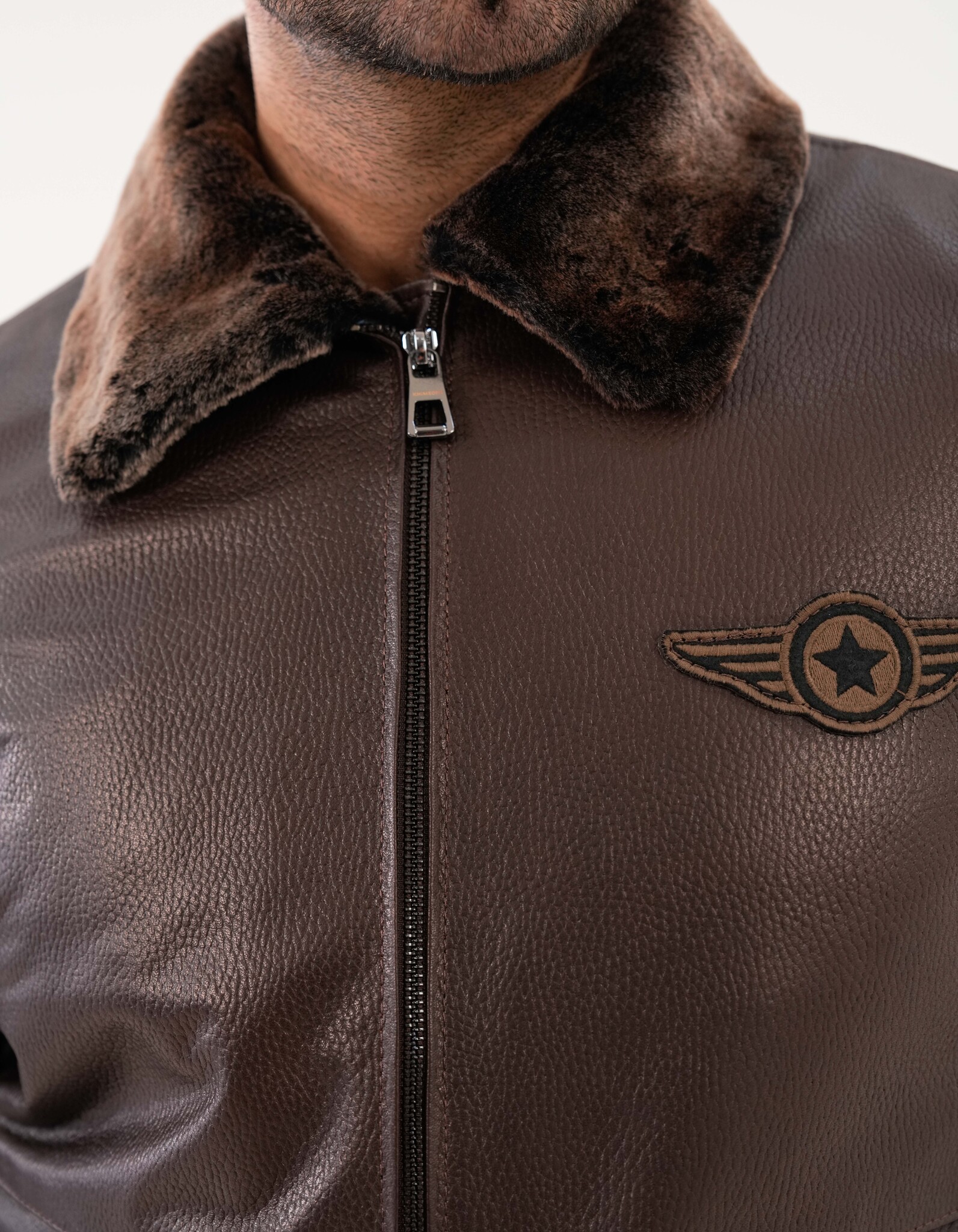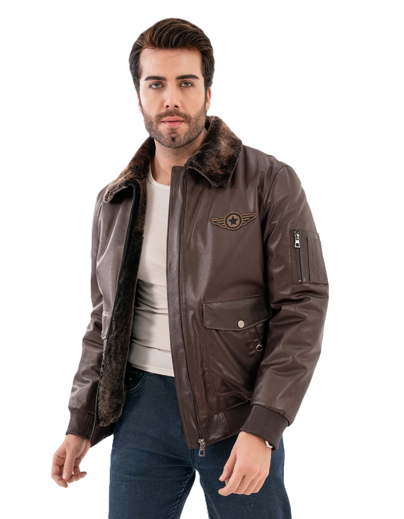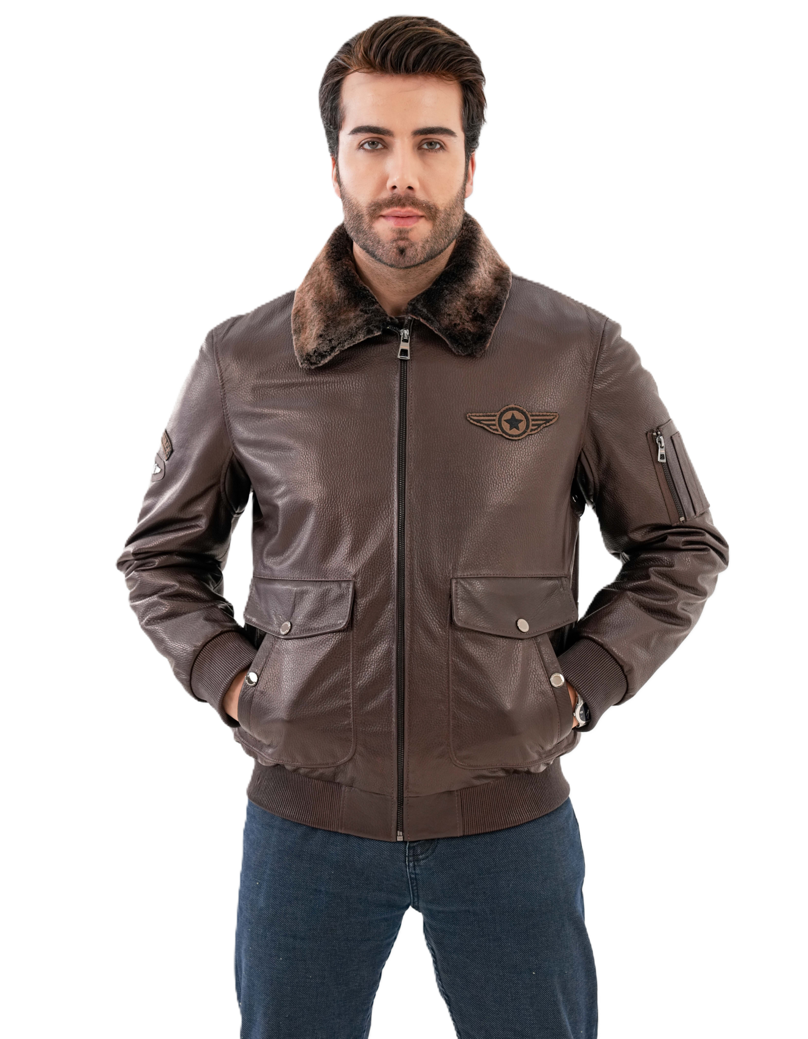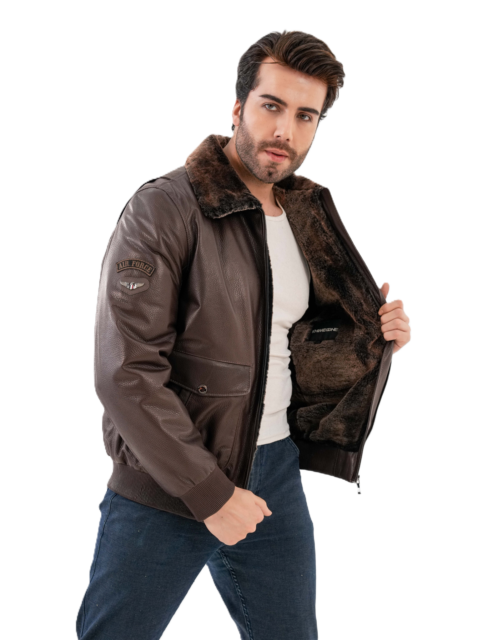 Куртка кожаная мужская зимняя "пилот" из натуральной кожи высокого качества на натуральном меху. Выполнена из кожи с "пористой" и неоднородной структурой подтверждающей натуральность, естественность кожи и предающей ей более дорогой вид в сравнении с "гладкой" кожей. Так же этот способ обработки кожи позволяет одежде сшитой из нее быть более износоустойчивее к царапинам и воздействию окружающей среды поэтому изделия из неё дольше сохраняют отличный внешний вид. Воротник и подкладка из натуральной овчины. Имеется четыре наружных кармана. Два боковых для рук и два с верхней загрузкой. Туда кладут ценные вещи так как из них исключено случайное вываливание. Два внутренних кармана на молнии. Кожа, мех и пошив-Турция.